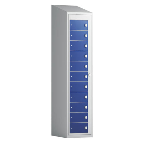 Tøjudleveringsskab 1x11 rum med skråt tag og blå døre med greb f/hængelås