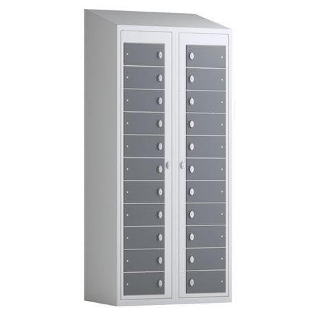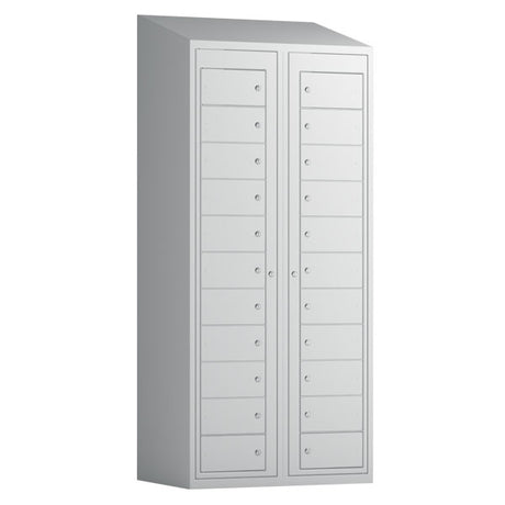 Tøjudleveringsskab 2x11 rum med skråt tag og lys grå døre med cylinderlås
