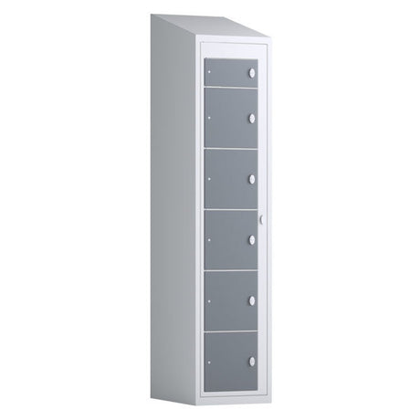Tøjudleveringsskab 1x6 rum med skråt tag og lys grå døre med cylinderlås