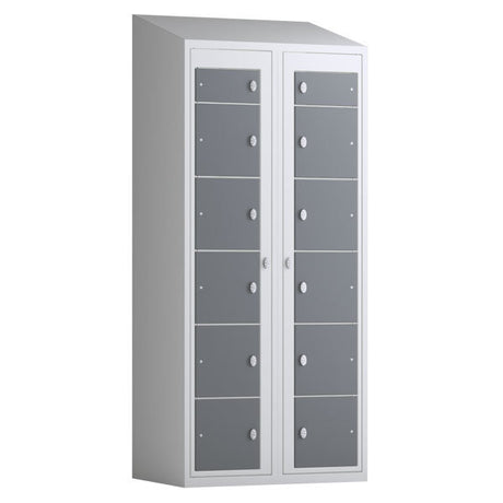 Tøjudleveringsskab 2x6 rum med skråt tag og lys grå døre med cylinderlås