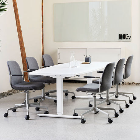 Hæve-sænkbart mødebord DNA, Lysgrå 2000x1200 mm bådformet, Hvid understel
