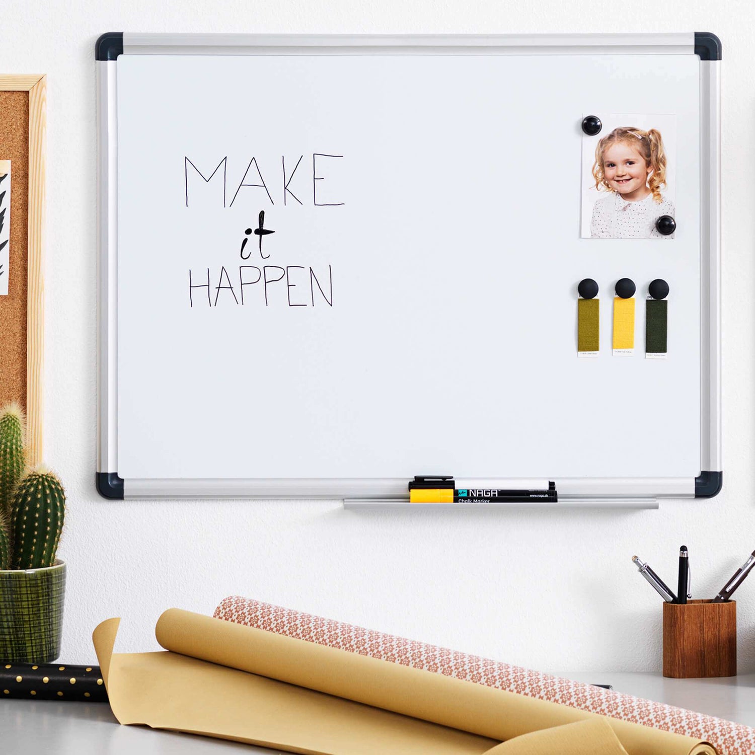 Magnetisk whiteboard tavle 120 x 180 cm. Med aluminiumsramme. Skriv på tavlen med en marker, og sæt ting op på den med magneter. Tavlen kan hænges vandret eller lodret. Incl. 1 penneholder 30 cm., 1 marker, og 2 magneter. OBS! Denne tavle leveres ikke til pakkeshop.Dette magnetiske whiteboard er den perfekte løsning til dit kontor, din skole eller dit hjem. Uanset om du skal præsentere en idé, organisere en plan, eller blot gemme vigtige beskeder, sikrer tavlen, at dine tanker er synlige og ordnede. Lav en investering i struktur og effektivitet i dag med denne alsidige magnetiske whiteboard-tavle.