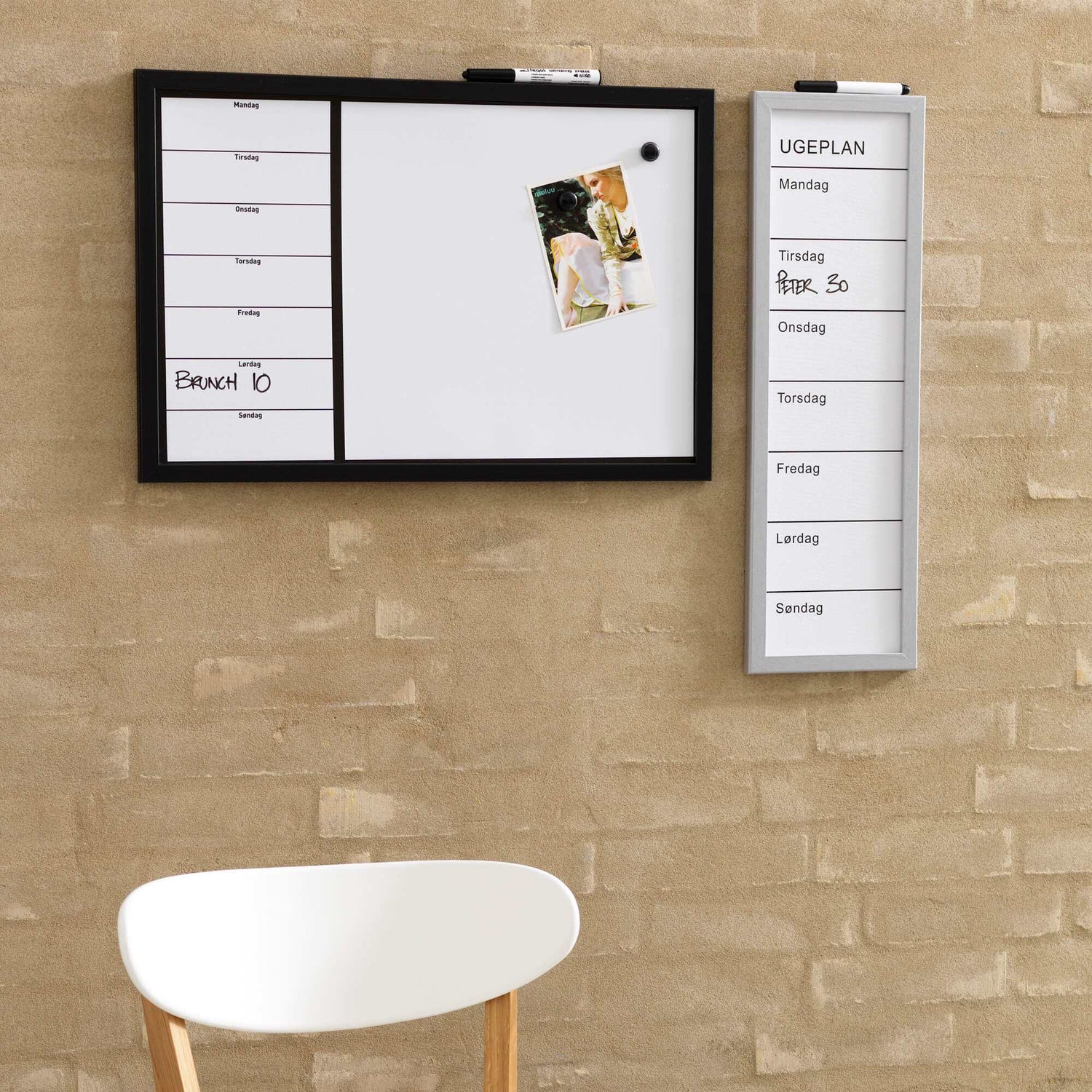 Whiteboard ugetavle 20 x 60 cm. Hvid ugetavle med sølvfarvet MDF ramme og dansk tekst. Ugetavlen gør det nemt at planlægge ugens aktiviteter. Den er perfekt til både madplaner og to-do-lister. Skriv direkte på tavlen med en kridtmarker eller whiteboard-tusch. En sort whiteboard marker medfølger. Tavlen rengøres nemt med en tavlesvamp eller en blød klud, evt. sammen med vores tavlerens. Tavlen ikke bør rengøres med husholdningssprit, da det vil fjerne den faste tekst på tavlen. Den slanke og pladsbesparende størrelse gør tavlen ideel til både små og store rum. Beslag til ophæng medfølger og monteres nemt med en hammer på bagsiden af rammen. Tavlen hænges op med to skruer i væggen (skruer medfølger ikke). Bemærk venligst, at denne tavle ikke er magnetisk.Dette whiteboard ugetavle er en stilfuld og praktisk løsning til at holde styr på alle ugens aktiviteter. Om det er i køkkenet, kontoret eller børneværelset, vil denne tavle hjælpe med at skabe struktur i din hverdag. Husk, at orden i planlægningen er første skridt mod succes. Køb din ugetavle i dag og oplev, hvordan det bliver lettere at få hverdagen til at fungere.