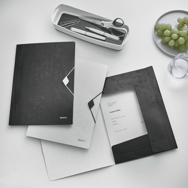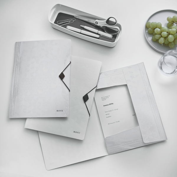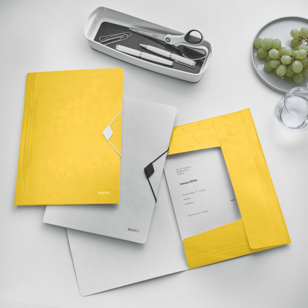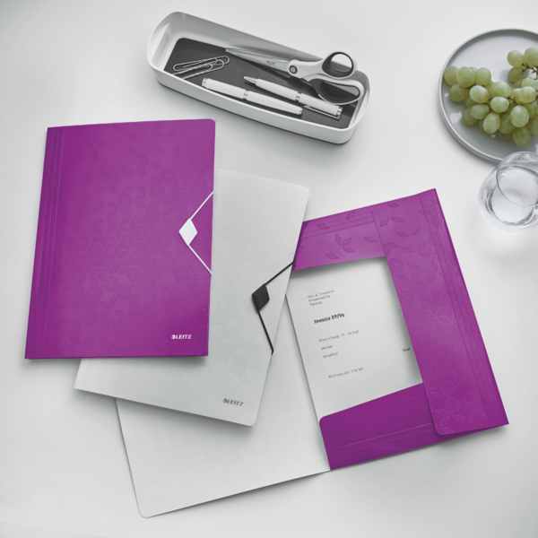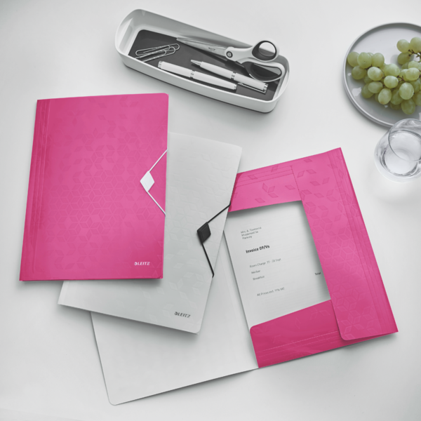 Opgrader din dokumentopbevaring med vores høj kvalitets 3-klap mappe i PP, designet i levende WOW farver med en unik to-farvet effekt. Denne mappe er ideel til daglig opbevaring af A4 dokumenter og løse ark.