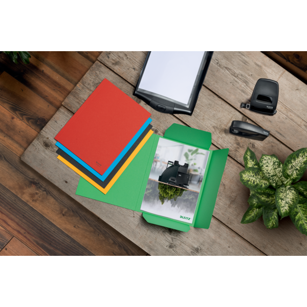 Iøjnefaldende 3-klap mappe i premium kvalitet. En af de mest anvendte mappetyper til dokumentbeskyttelse og transport. Med indvendige flapper for at forhindre, at dokumenter glider ud. Lavet af 100% recirkuleret karton, 100% recirkulerbar og med Blå Engel miljøcertificering. Denne robuste og praktiske mappe komplementerer perfekt andre produkter fra Leitz Recycle-serien og er lavet til at holde. Moderne og stilfulde kontorartikler, som vil passe ind på kontoret og i hjemmet.