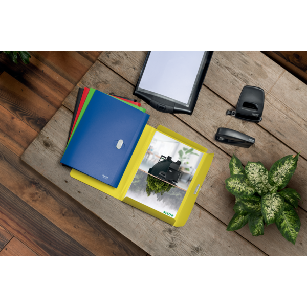 Opgrader din organisering med denne iøjnefaldende 3-klap mappe i premium kvalitet fra Leitz Recycle-serien. Perfekt til skole, kontor og hjem, med indvendige klapper for at sikre, at dine dokumenter bliver på plads.