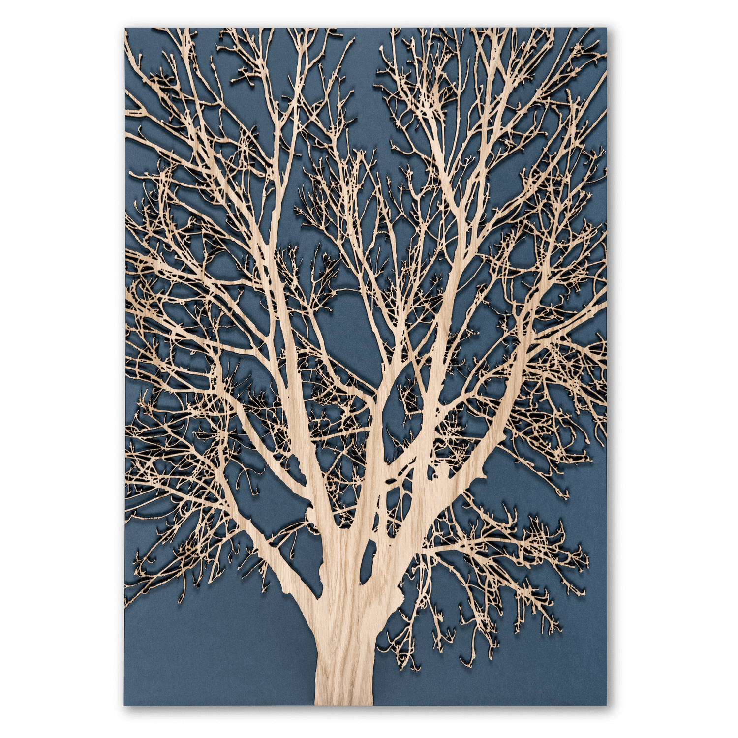 Natur træ udskåret i egefiner med blå baggrund 42 x 60 cm.Dansk designet, produceret og håndlavet Natur træ i egefiner. Overflade af ubehandlet egefiner, monteret på en farvet bag plade. Ophængs beslag bagpå, så der skal blot en skrue i væggen. Udover udskæring af træet, der sker på maskine, er alt andet lavet i hånden.