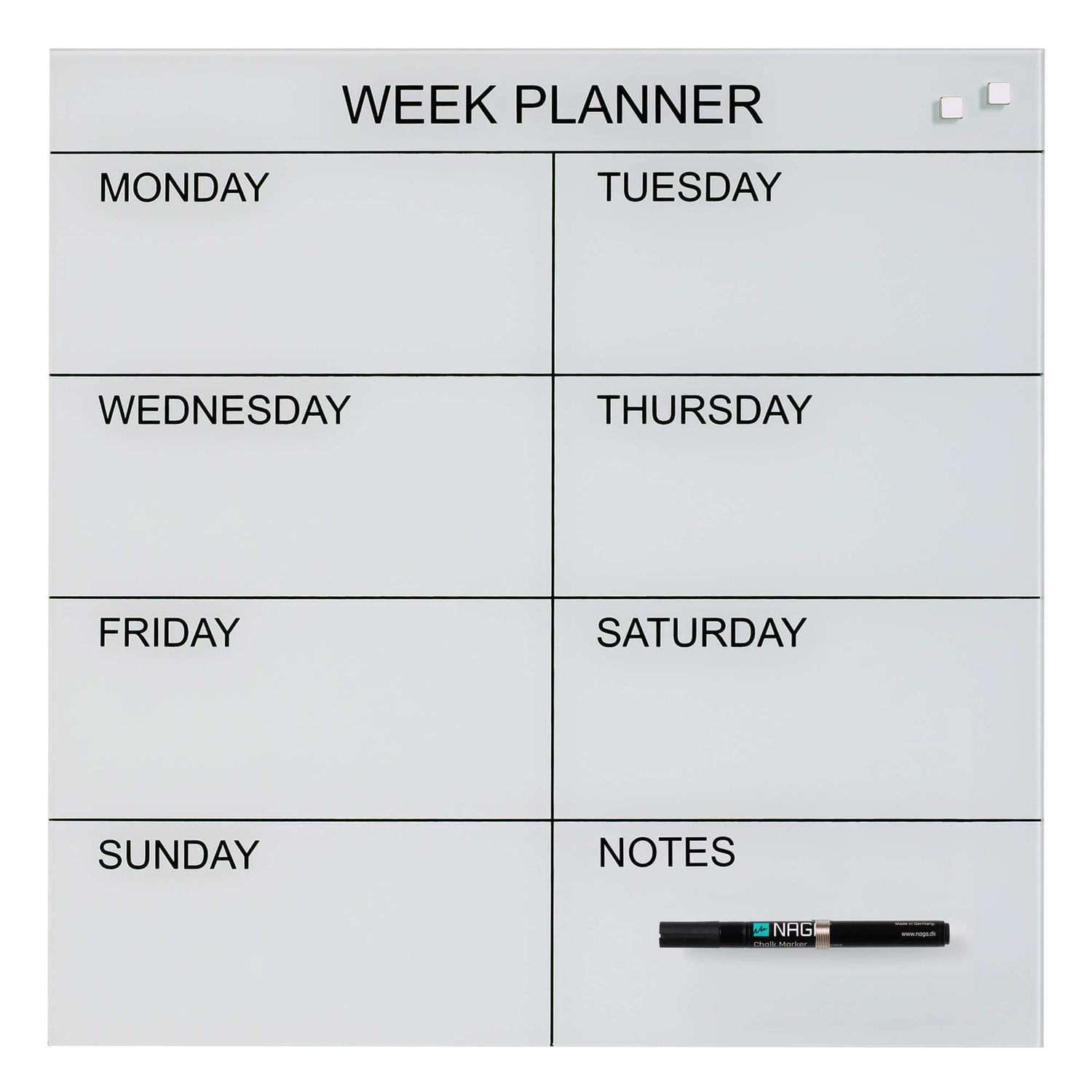 45 x 45 cm. Hvid. Glas uge tavle Engelsk