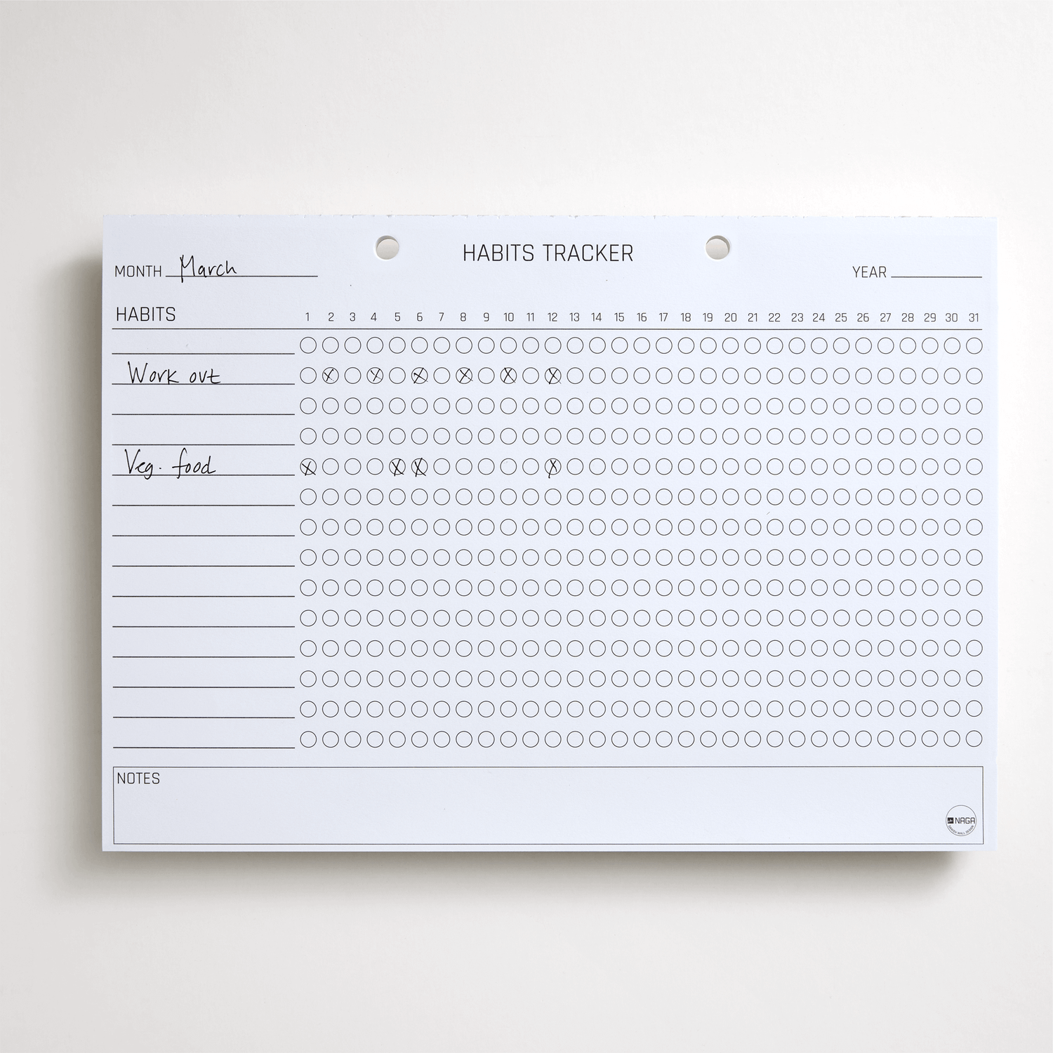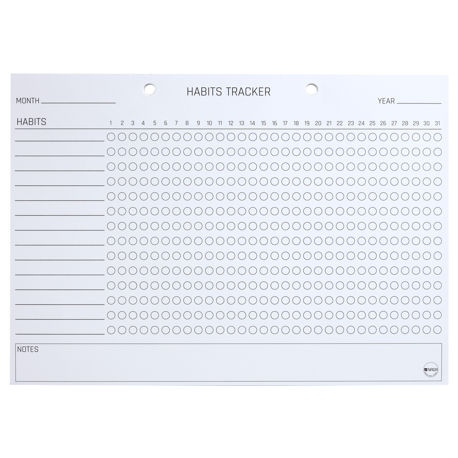 Engelsk A4 blok med Habit tracker, 52 sider, 100 gr.En habit tracker blok kan hjælpe dig til at opbygge nye vaner eller opretholde eksisterende vaner. Du beslutter selv hvilke vaner, du vil fokusere på, inden månedens begyndelse, og skriver dem ind på arket. Hver dag kan du udfylde et felt ud for hver aktivitet, du har gennemført den pågældende dag. Efter en måned har du således et tydeligt overblik over din udvikling. En Habit tracker hjælper dig til at komme tættere på dine overordnede mål.