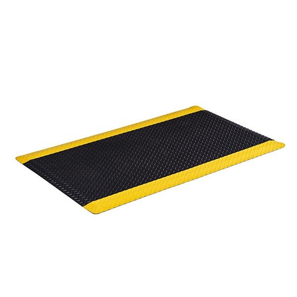 Holdbar arbejdspladsmåtte med durkmønstret overflade. Blød og dæmpende underside af polyvinyl sikrer god ergonomi og komfort. De skrå kanter reducerer risikoen for at snuble. 12 mm tykkelse giver god ergonomi, og tæppet isolerer effektivt mod kulde og vibrationer. Ergo Stripe er bedst egnet til arbejdsborde og maskiner i tørre lette arbejdsmiljøer som butikker, lagerhuse, sortering, pakkestationer og samlebånd. Måttens blødabsorberende egenskaber bidrager også til skridsikker beskyttelse.Anvendelsesområde: arbejdsmiljøer i tørt lys som butikker, lagre, sortering, pakkeborde og samlebånd.