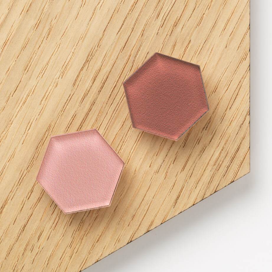 Super Stærke magneter. Hexagonal facon. Akryl i rosa og terracotta.2,5 x 2,8 cm. 2 stk.Magneten er perfekt til glastavler, finertavler og whiteboardtavler.