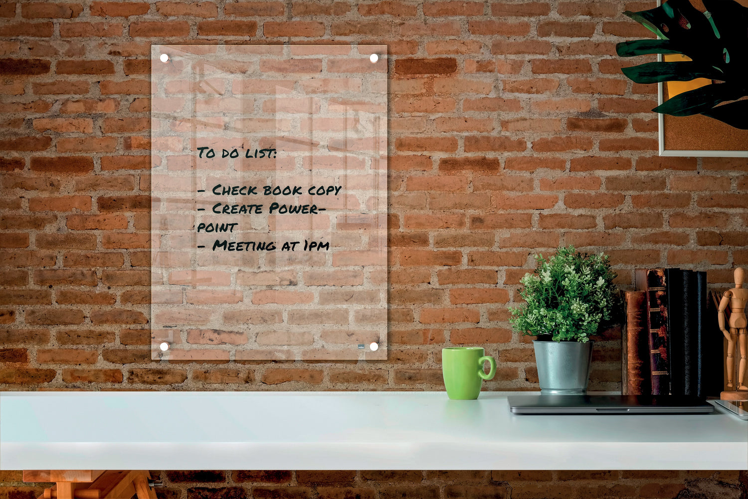 | attribute 2 | Det klare mini-whiteboard i akryl er monteret på væggen ved hjælp af stilfulde hjørnebeslag i stående eller liggende format |