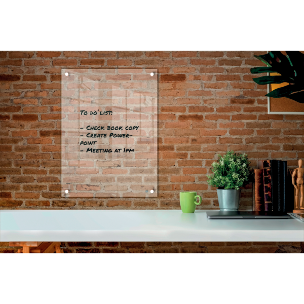 - Det klare mini-whiteboard i akryl er monteret på væggen ved hjælp af stilfulde hjørnebeslag i stående eller liggende format
