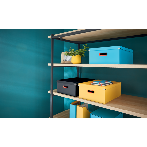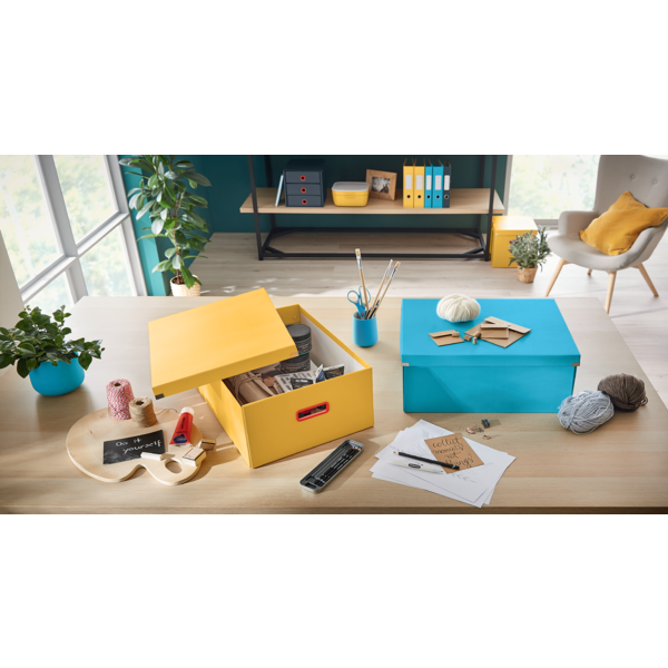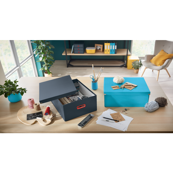 Føl dig hjemme, uanset hvor din arbejdsdag fører dig hen med Cosy serien fra Leitz. Med det minimalistiske design og indbydende farver kan du tilføje stil og farve til dit arbejdsområde. Click & Store Cosy stor opbevaringsboks med låg og et praktisk stilfuldt rødt gribehul har plads nok til at gemme og transportere alle dine A3-dokumenter og andre større ting, såsom en bærbar computer eller et tastatur. Det er perfekt til at pakke dit hjemmekontorsartikler væk eller til at blive brugt som en hot desking boks på kontoret. Med det pladsbesparende design kan denne sammenklappelige opbevaringsboks let gemmes væk, når den ikke er i brug. Leitz Click & Store Cosy er ideelle til at holde hjemmet og kontoret fri for rod, og de førsteklasses opbevaringsbokse af recirkuleret karton vil få dig til at føle dig afslappet og produktiv hele dagen. Volumen 29 liter.