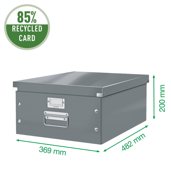 Universal stor opbevaringsboks til A3-format. Kan foldes sammen til pladsbesparende opbevaring, når den ikke er i brug. Robuste metalhåndtag til nem transport. Etiketholder til indeksering. Fremstillet af stærkt, førsteklasses genbrugspap. Lamineret overflade og hjørneelementer af metal giver en bedre og mere holdbar beskyttelse. Moderne og nutidigt design, der vil se godt ud på ethvert kontor. Volumen 29 liter.