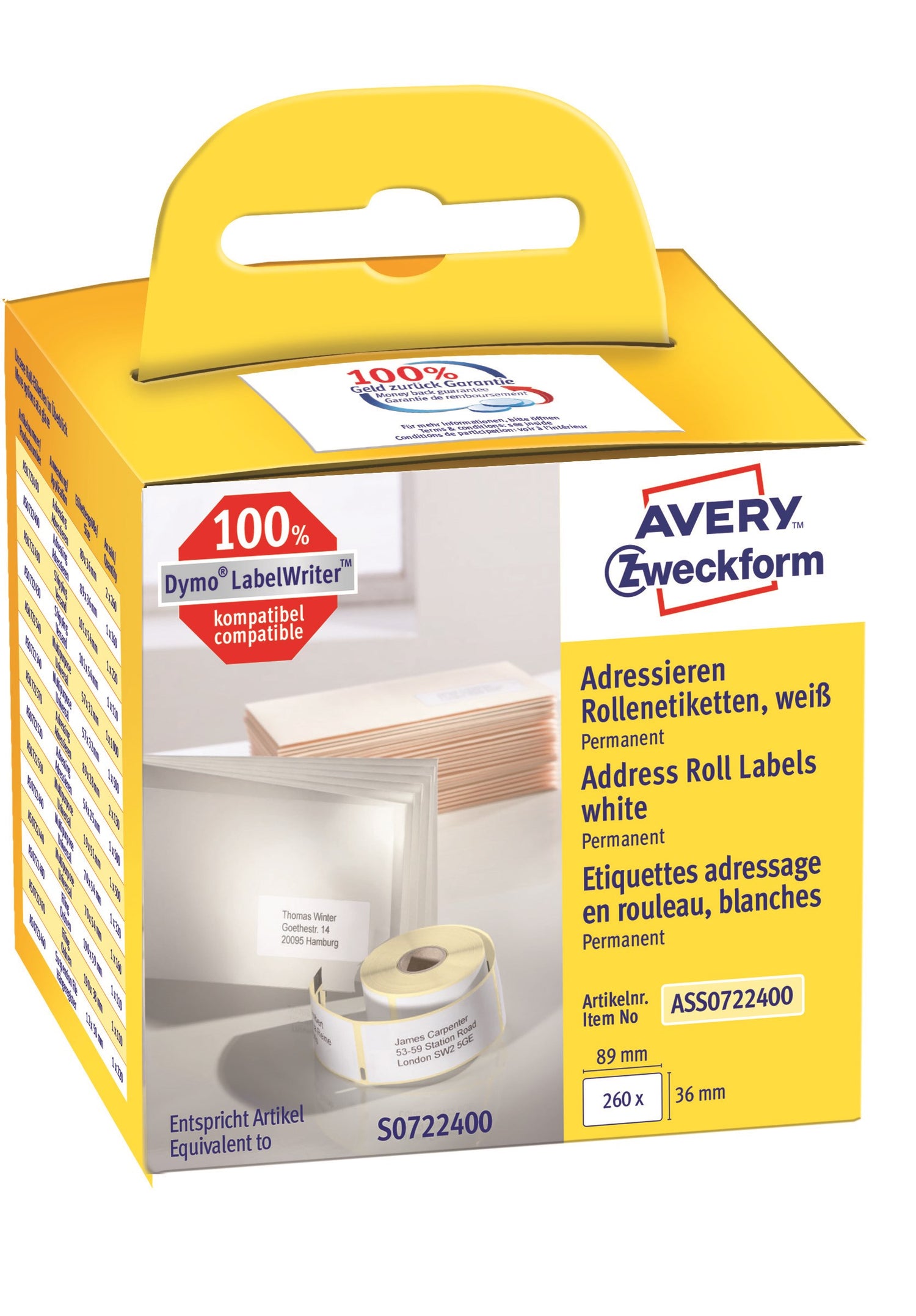 Har du en DYMO® LabelWriter ™ eller Seiko Smart Label Printer®, og mangler etiketter til den? Avery's ASS0722400 adresseetiketter på rulle til etiketprintere, svarer til DYMO® S0722400 og Seiko® SLP 2RLE, og er 100% kompatibel med DYMO® LabelWriter ™ LW310, LW330T, LW400 serie, LW450 Series, 4XL og Seiko Smart Label Printer®! Passer desværre ikke til Dymo® Labelwriter™ serie 500, 550 og 5XL, som bruger RFID-chipping. Med denne pakke får du Avery's velkendte kvalitetsetiketter til en meget attraktiv pris. I pakken får du en rulle med 260 etiketter 36 x 89 mm, i en lille pakke til det mindre forbrug på kontoret eller derhjemme. De er velegnede til breve, post og andre forsendelser. Thermoetiketterne er kendetegnet ved en usædvanelig god klæbeevne og er fri for Bisphenol A (BPA). Etiketterne de er FSC® certificerede og dermed kun produceret af papir fra ansvarlig skovbrug, samt kan genanvendes sammen med almindeligt papiraffald. Du kan nemt og efter behov printe en eller