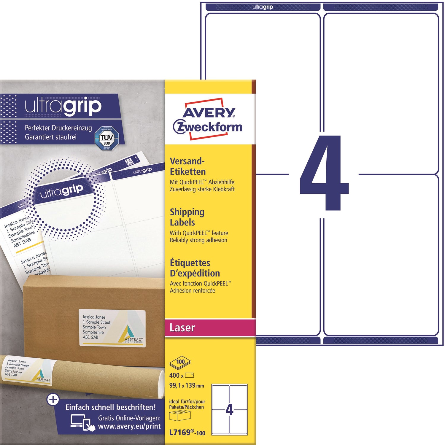 Giv dine pakker og breve et professionelt udtryk ved at bruge Avery pakke-etiketter. Avery's L7169-100 pakke-etiketter med QuickPEEL™ & Ultragrip har 4 etiketter/ark og 400 etiketter/pk, og er fremstillet i et højkvalitetsmateriale, der holder til hele turen. Etiketstørrelsen er ideel til pakker, rør og kasser. De er kompatible med alle standard s/h- og farvelaserprintere. Den høje papirkvalitet giver dig flotte og knivskarpe prints. Etiketarkene er forsynet med vores innovative Ultragrip-teknologi, som er unikt tredimensionelt mønster, der gør det muligt for printere at opnå et perfekt greb i arket. Gribeområdet sikrer, at printerens ruller kan få fat i, indføre og styre etiketarket endnu bedre. Det sikrer at du ikke behøver bekymre dig om etiketterne printes skævt, sidder fast i printeren og giver printerstop. Derudover får du etiketter med QuickPEEL™ funktion. Det vil sige, at du skal blot fjerne den perforerede del af bagarket for at blotte hjørnerne af etiketterne så du nemt kan