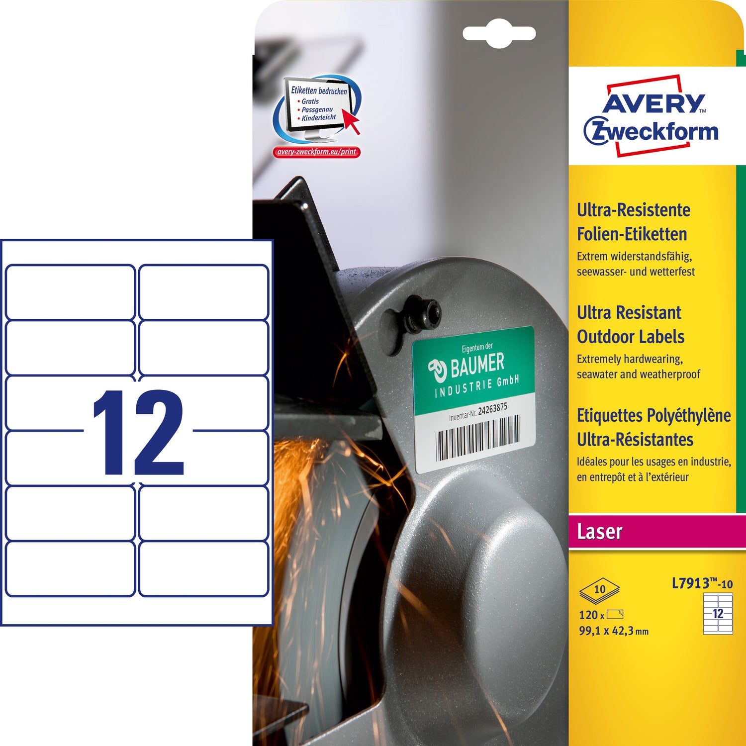 Ekstremt holdbare, resistente, elastiske etiketter fra Avery er den helt rigtige etiketløsning i f.eks. vådrumsmiljøer til at mærke på fliser, overflader og sanitet, som ofte bliver tørt af. Etiketternes elasticitet gør dem også perfekte på buet eller krumt produktionsudstyr eller i lagerfaciliteter. Etiketterne har en lang og stærk holdbarhed samt fremragende klæbeevne, så du skal ikke bekymre dig om, om dine budskaber falmer eller falder af efter kort tid. Etiketten tåler udover vand og temperatursvingninger, også saltvand - derfor er den ideel til skiltning på containere og i marine og offshore industrien. Etiketterne er vaskbare, elastiske, modstandsdygtige overfor gængse rengørings- og opløsningsmidler samt olie og snavs, tåler høje og lave temperaturer (-40° til +150°C). Avery's L7913-10 ekstremt modstandsdygtige og slidstærke etiketter har 12 etiketter/ark og 120 etiketter/pk, hvor hver etiket måler 99,1 x 42,3 mm. Etiketternes størrelse er velegnet til mellemstore genstan