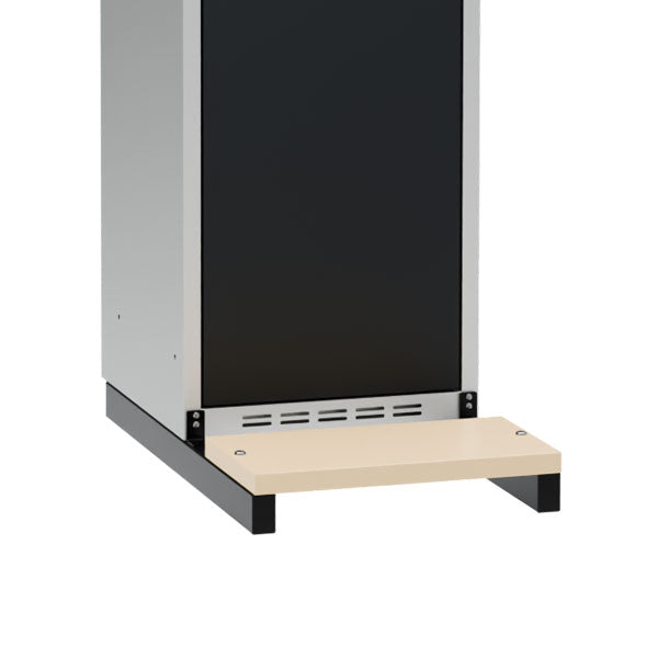 Bænkstel Væg til garderobeskabe med bredde 400 mm. Sæde i birk højtrykslaminat. Helsvejst og pulverlakeret metal. Farve sort, RAL 9005. Totaldybde er 700 mm (passer til skabsdybde 400 mm).