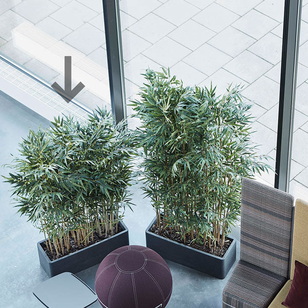 Bambus kunstig plante i lav udførelse (ca. 1500 mm), leveres komplet med 3 stk planter som sættes i den medfølgende rektangulære potteskjuler. Dette er kvalitets produkter til indretning af kontor eller møderum - ja, over alt hvor folk færdes.