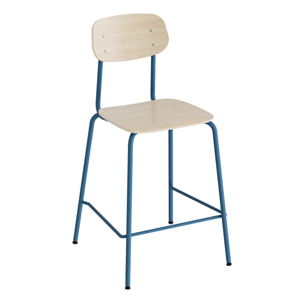 Barstol Atlas 2111BS med sæde og ryg i hvidpigmenteret egelaminat og pulverlakeret blåt stel RAL 5009 G10, siddehøjde 620 mm.