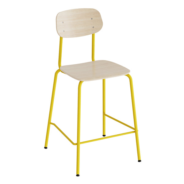 Barstol Atlas 2111BS med sæde og ryg i hvidpigmenteret egelaminat og pulverlakeret gult stel RAL 1018 G10, siddehøjde 620 mm.