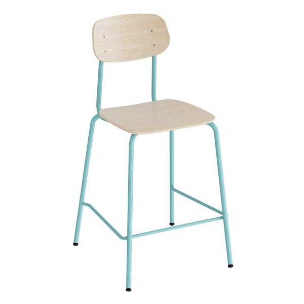 Barstol Atlas 2111BS med sæde og ryg i hvidpigmenteret egelaminat og pulverlakeret tyrkist stel RAL 6034 G10, siddehøjde 620 mm.