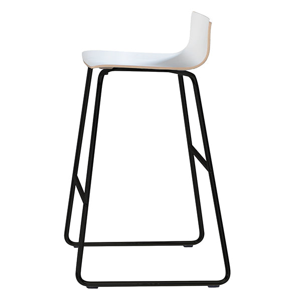 Barstol Cafe VII med sæde i hvid laminat på sorte stolben. Stolens samlede bredde er 530 mm og siddehøjde er 730 mm. Barstole i Cafe VII passer udmærket sammen med barbordet Amy. Vælg farve på stolben som matcher understellet på det valgte bord.