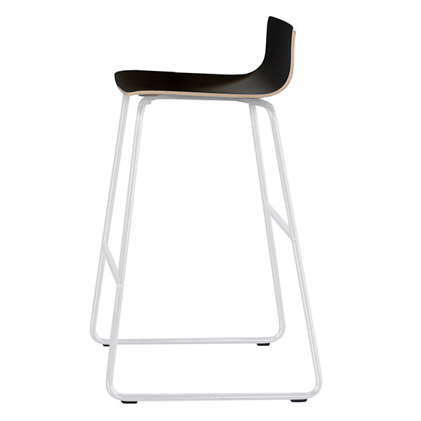 Barstolen har et sæde i sort laminat og hvide stolben.