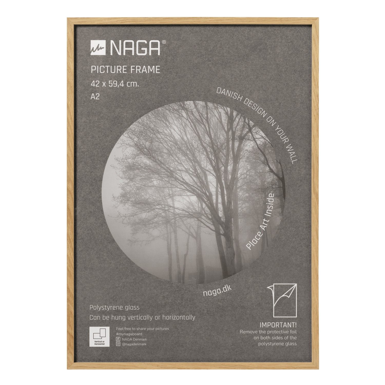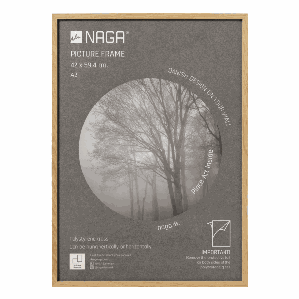 A2 ramme i massivt egetræ Moderne ramme med plexiglas udført i massivt FSC® certificeret egetræ. Den flotte ramme passer til et billede på 42x59,4 cm (hvad der svarer til en A2 plakat). Trærammen måler 1,2 cm i bredden og 2,2 cm i dybden cm og giver et stilfuldt udtryk. Den fine ramme har metalophæng bagpå, så du nemt kan hænge den op. Rammen er udført så du både kan hænge den vertikalt og horisontalt, på den måde kan du skabe den helt rette billedvæg. En tidløs ramme, som du kan få glæde af i mange år. Indram billeder, din egen eller andres kunst og skab et flot design på dine vægge.Vores A2 ramme i massivt egetræ er mere end bare en ramme - det er en investering i dit hjem, der ikke bare viser dine billeder, men præsenterer dem. Gør dit hjem unikt og personligt med denne elegante ramme, der ikke blot hænger på din væg – den pryder den.