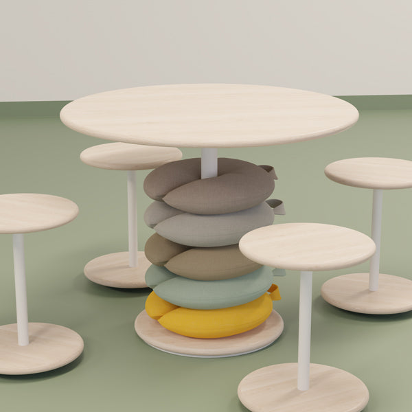 Bord Donut med søjleunderstel og solid fod i stål. Bordplade i massiv hvidpigmenteret ask med bløde afrundede kanter.Bordets søjle er dimensioneret således at man kan stable Donut siddepuder.