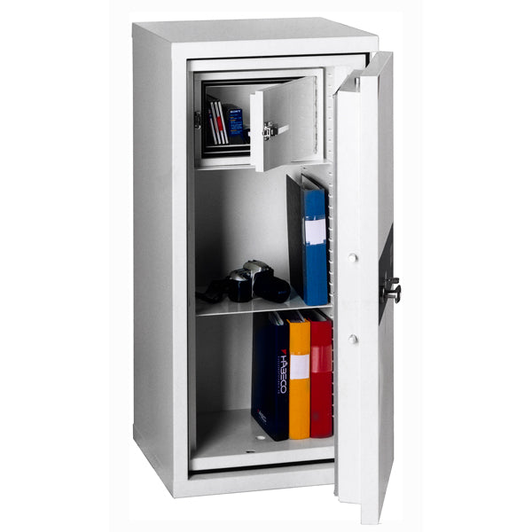 Brandsikkert Værdiskab Eurobasic 100 er EN1143-1 godkendt til tryg opbevaring af værdifulde dokumenter, kontanter eller andre værdisager. Skabet har indv. mål (hxbxd) 1020x 390 x 330 mm og 2 flytbare hylder.