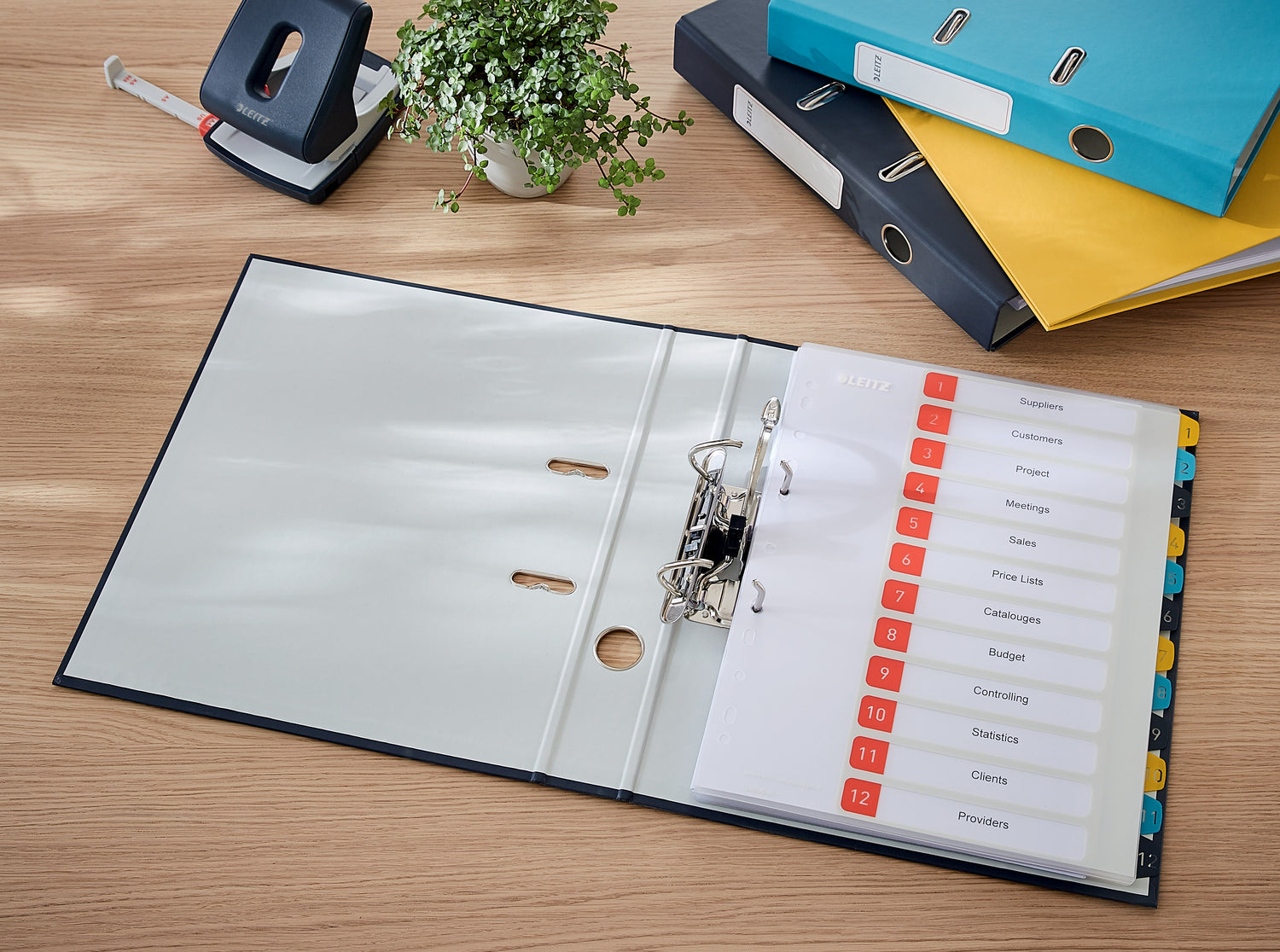 Den har en 50 mm ryg, som kan holde op til 350 A4 ark af 80g papir.