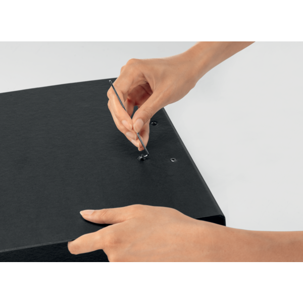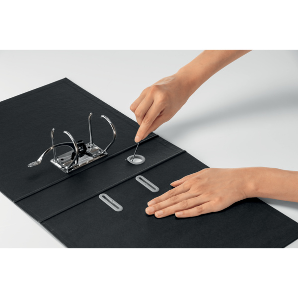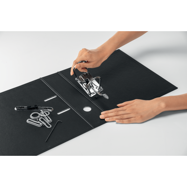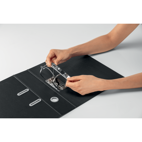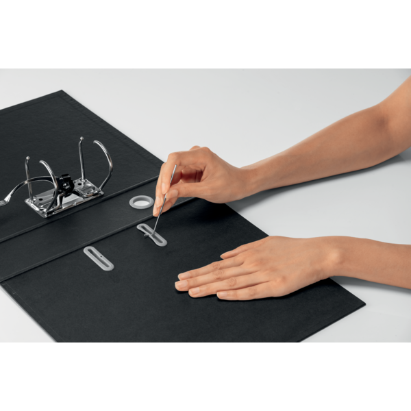 - Lysegrå, genanvendt plast tommelfingerhul og rado-ringe for let at kunne tage brevordneren ud fra en hylde og sikring af brevordneren, når den er lukket og lodret stående