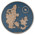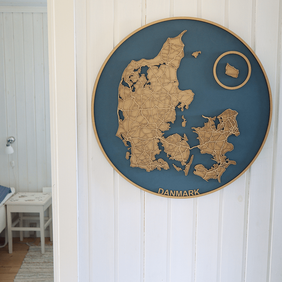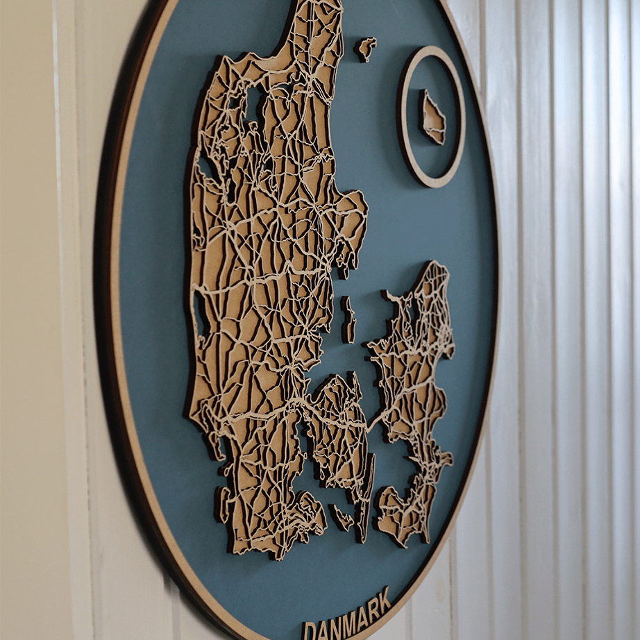 Danmarks kort udskåret med blå baggrund Ø 60 cm.Dansk designet, produceret og håndlavet. Overflade af fiber træ, monteret på en farvet bagplade. Inkorporeret ramme og ophængs beslag, så der skal blot en skrue i væggen. Udover udskæring af kortet, der sker på maskine, er alt andet lavet i hånden.