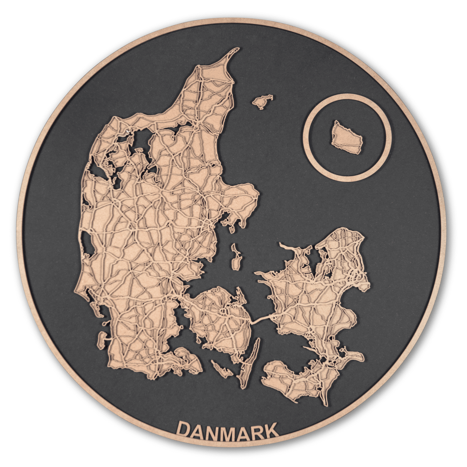Dette unikke Danmarks kort, med en diameter på 60 cm, er en smuk repræsentation af landet, præsenteret i en afdæmpet sort farve. Kortet er udskåret med præcision og monteret på en sort farvet bagplade, som skaber en stærk kontrast, der virkelig får landets form til at springe frem.