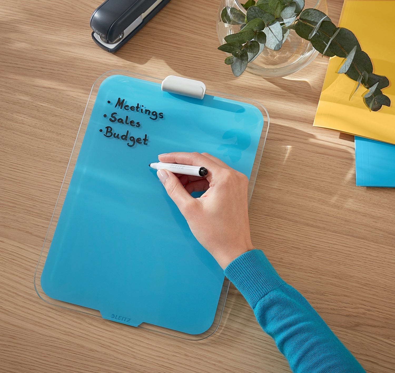 Føl dig hjemme med Cosy serien fra Leitz uanset hvor din arbejdsdag tager dig hen. Med det minimalistiske design og de indbydende matte farver giver du stil og farve til dit arbejdsområde. Cosy glas skrivebords flipover til notestagning kan bruges igen og igen. Skriv med en marker til whiteboards, tør væk og start på ny. Denne premium kvalitets glas skrivebords flipover er et perfekt tillæg til hjemmet eller kontoret for at sikre, at du forbliver afslappet og organiseret hele dagen. - Glas skrivebords flipover er ideel til notestagning, beskeder og reminders - Kompakt, A4 clipboard størrelse, der passer flot på dit skrivebord eller i hjemmet - Skriv eller sæt dine noter direkte på glas whiteboardoverfladen - Overfladen er lavet af hærdet sikkerhedsglas med ultra-sletbarhed og en høj modstand mod blækpletter, penmærker, ridser og buler - Rammeløst design maksimerer skrivepladsen - Integreret penneholder til opbevaring af penne og udvisker - Leveres med en mini dry erase marker, d