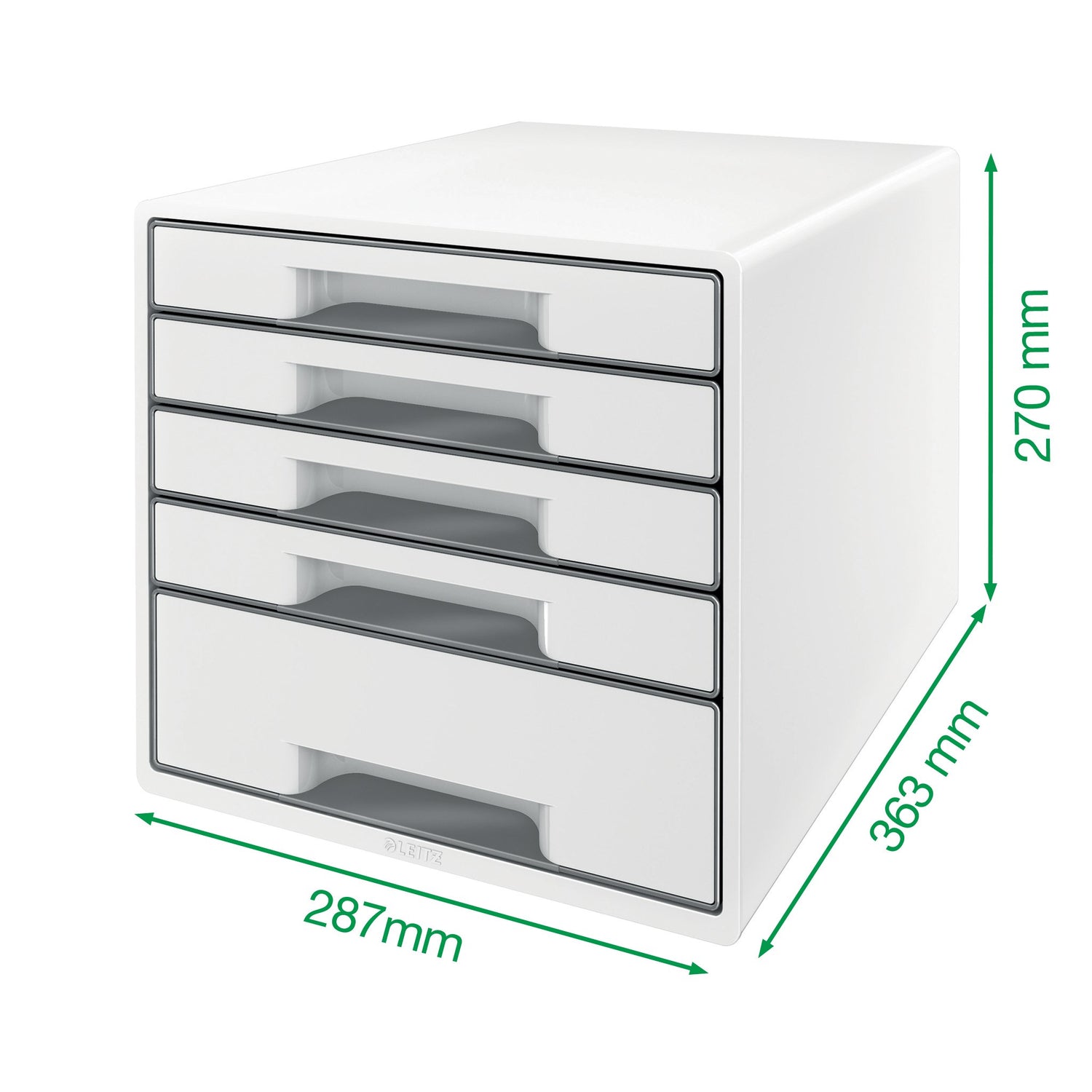 Desk Cube WOW har i alt 5 skuffer: 4 små skuffer til papirer og mapper samt 1 stor skuffe til større ting som hulapparater og hæftemaskiner.