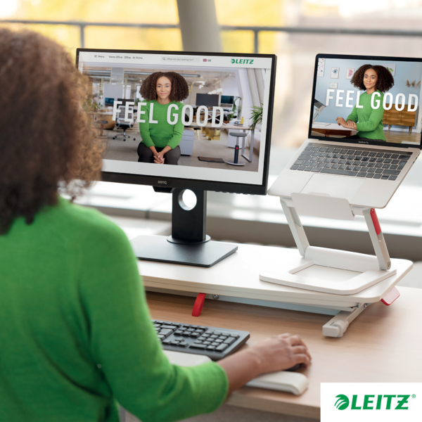 Leitz Ergo Cosy Desk-konverter tilbyder optimal ergonomi ved at muliggøre skift mellem siddende og stående arbejdsstilling. Den pneumatiske justering sikrer nem højdejustering, mens det pladsbesparende design passer perfekt til ethvert skrivebord.
