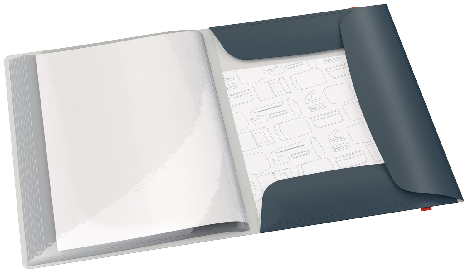 Displaybogen har en integreret 3-klap mappe bagest og ekstra folder på klapperne, som øger kapaciteten.