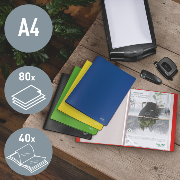 Iøjnefaldende PP displaybog i premium kvalitet til daglig brug i skole, kontor og hjem. 40 klare plastlommer fikseret inde i ryggen, ideel til at præsentere og bære trykte A4-tegninger, fotos og papirer. Fremstillet af 90% (blanding af præ- og post consumer) recirkuleret PP, 100% recirkulerbar. Denne robuste og praktiske displaybog supplerer perfekt andre produkter fra Leitz Recycle-serien og er lavet til at holde. Moderne og stilfulde kontorartikler, som vil passe ind på kontoret og i hjemmet.