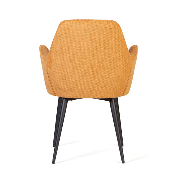 Stolen Dixi, her i okkergul udgave med sortlakerede stålben, er måske primært beregnet til at blive brugt som spisestuestol. Det er en rummelig og behagelig stol, der derfor er lige så velegnet i et lille hyggeligt mødelokale, som en besøgsstol på et kontor eller i enhver social zone.