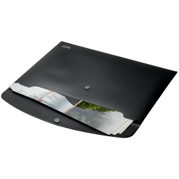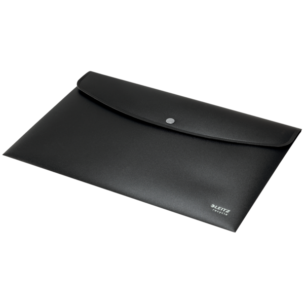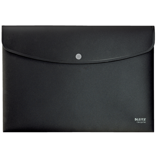 Dokumentmappe fra Leitz Recycle-serien i premium kvalitet, ideel til daglig brug i skole, kontor og hjem. Fremstillet af 80% recirkuleret plast og 100% recirkulerbar, med Blå Engel miljøcertificering. Denne moderne og stilfulde dokumentmappe beskytter dine dokumenter op til A4-størrelse med dens trykknaplukning, der forhindrer dem i at glide ud.