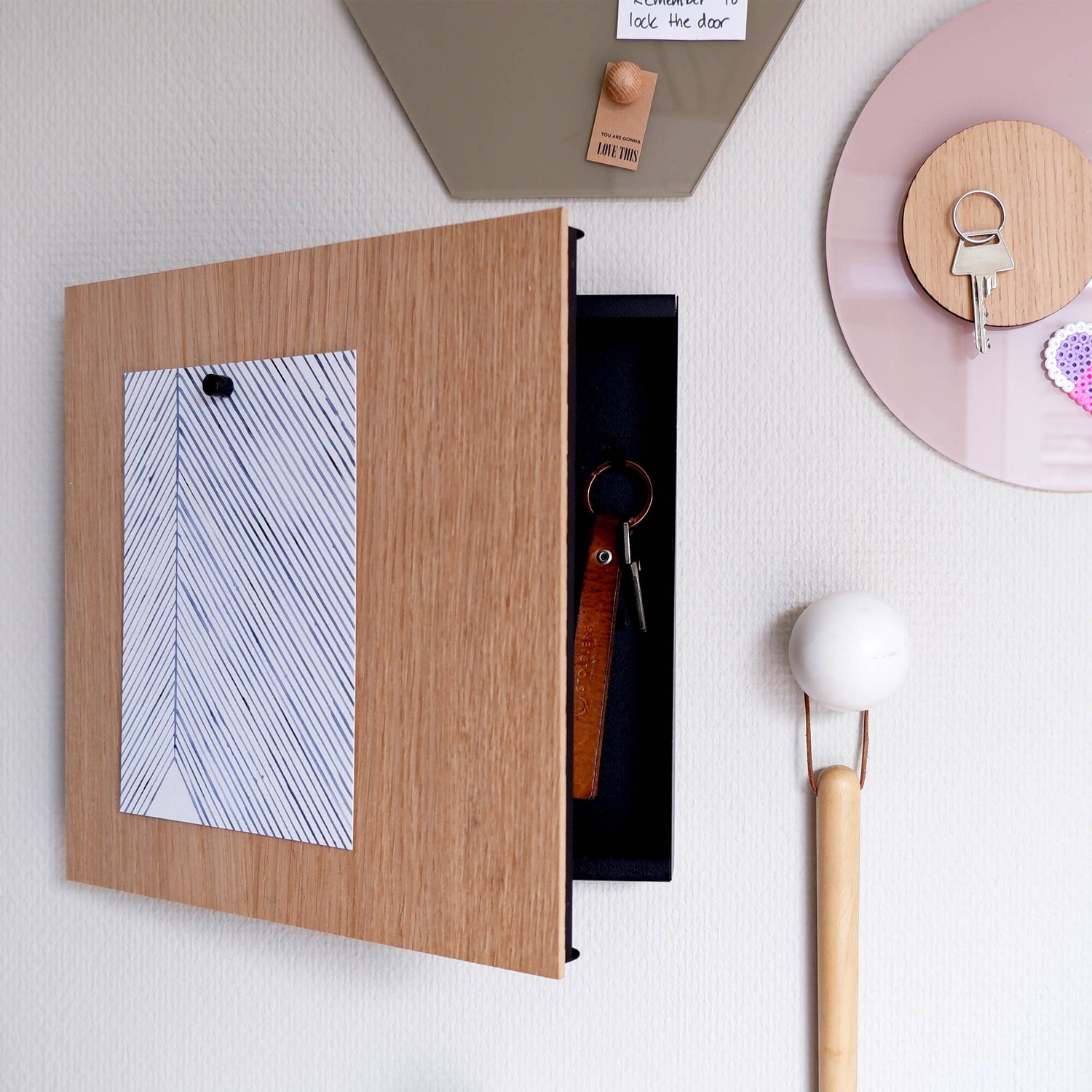 Nøgleskabet måler 30 x 30 cm med en dybde på 5 cm.