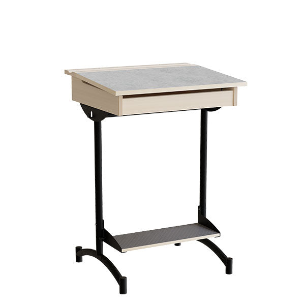 Bordpladen er i lysgrå linoleum, og stellet er sort.