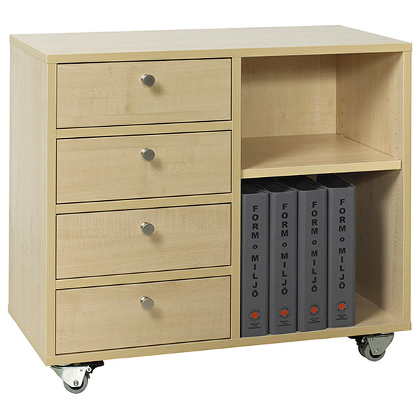 Mobil elevopbevaring til bøger og materiale i skole og børnehave, leveres på hjul, med 4 skuffer og 2 hylder og i birk laminat udførelse, h x b x d = 720 x 800 x 400 mm.