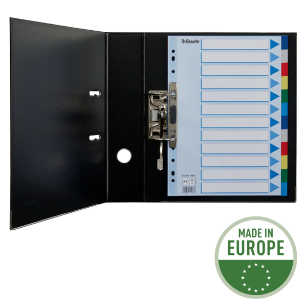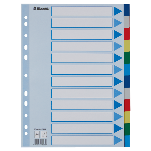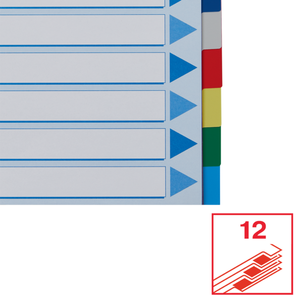 Organisér dine dokumenter med vores funktionelle og stilfulde faneblade. Disse faneblade er udstyret med 12 forskellige farver, der gør det nemt at inddele og finde indholdet hurtigt. Forsiden tilbyder rigelig plads til beskrivelse og er forstærket med huller for varig brug.