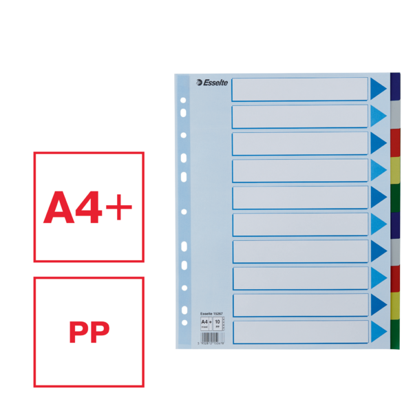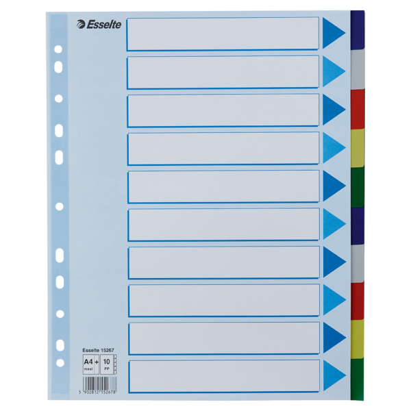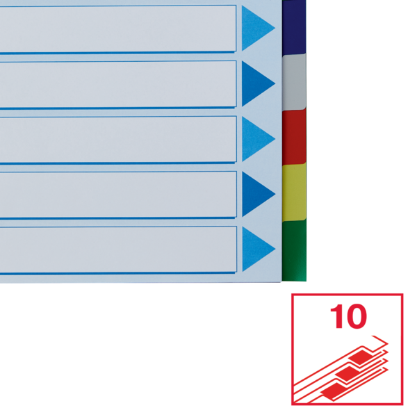 Oplev praktiske faneblade i solide farvekombinationer, designet til effektiv organisering. Med et A4 Maxi format sikrer de hurtig adgang, selv når dokumenter er arkiveret i lommer. De 10 farvede faner gør sorteringen nem, mens en plastforstærket hullet stribe på forbladet øger holdbarheden.