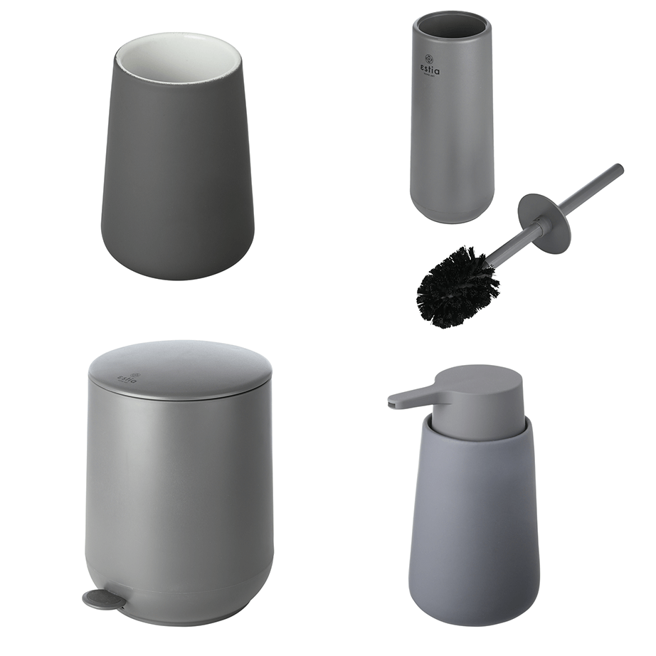 Pedalspanden og toiletbørsten er fremstillet i plast, mens sæbedispenser og tandkrus er lavet af keramik med mat grå overflade.