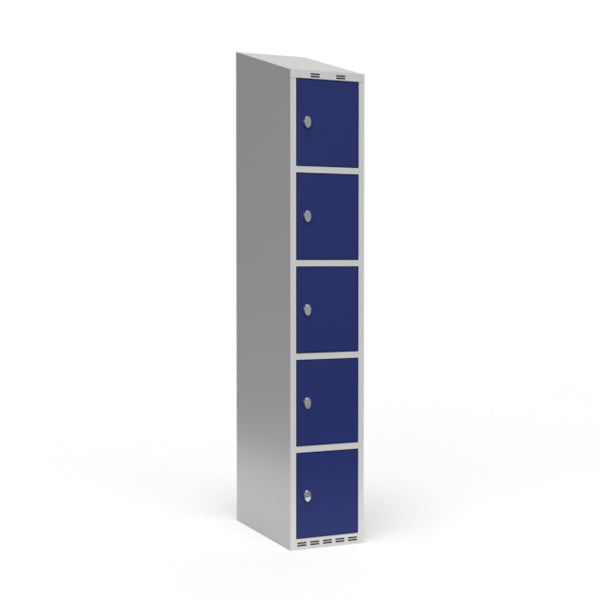 Garderobeskab 1x300 mm Skråt tag 5 rum i højden Blå dør Greb for hængelås
